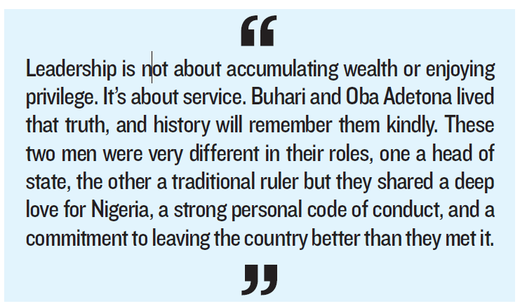 In a series of condolence messages, the Nigerian Supreme Council for Islamic Affairs (NSCIA), the Muslim Ummah of South-West Nigeria (MUSWEN), and the Muslim Rights Concern (MURIC) celebrated the late leaders as exemplars of integrity, faith, and public service. They described Buhari and Oba Adetona as men whose lives stood as testimonies to principled leadership and unwavering devotion to national and religious causes.