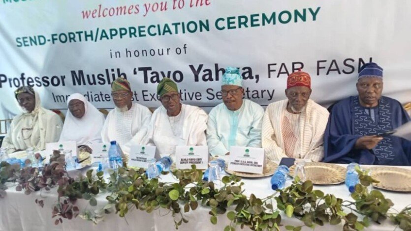 *L-r: Prof Lateefah Durosinmi, Hajia Tayo Yahya, Prof Muslih Tayo Yahya, Alhaji Rasaki Oladejo, Alh Rafiu Adisa Ebiti, Prof DOS Noibi and Prof Muibi Opeloye The Muslim Ummah of South West Nigeria (MUSWEN) Saturday organised a sendforth/appreciation ceremony for its immediate past Executive Secretary l, Prof Muslih Tayo Yahya at…